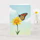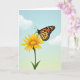 This card shows a large orange-and-black butterfly hovering close to a sunny yellow flower, as if leaning in for a gentle hello ❤️. Its wide wings are divided into warm orange panels with dark veins, and a neat row of small white spots traces the darker outer edge. Curved antennae and a slight tilt of the body add a tender, almost friendly focus toward the bloom. The flower sits in the lower middle with golden petals spreading from a deeper yellow, textured center, held by a sturdy green stem. Behind them, the sky fades from rich blue at the top to a soft green near the horizon, giving the scene an open, airy calm. The design includes a short Mother’s Day message placed near the top in a simple, dark font that stands out clearly against the sky 🌼. A few soft white clouds drift in the upper-left area, lightly brushed against the blue.