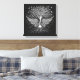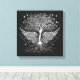 Metallic silver set of wings, tree and roots symbolising wings to fly with details of birds, hearts and flowers on a black background. Artwork features wording, “Give the ones you love wings to fly, roots to come back and reasons to stay. She flies on her own wings. Rooted in love, she blooms.” Wrapped Canvas