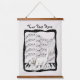 This tapestry with wood hangers has a black and white image of a white fluffy cat walking on the top of piano keys with bars of wavy music notes framed in a black with white dotted frame. Customise your text with the template.