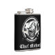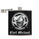 A cool and funny winking chef skull with crossed chef knives, against a black background. Add your name, for a personalised touch.