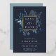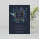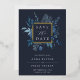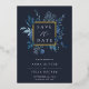 Our Winter Azure wedding save the date frames the words "save the date" with an elegant square border of lush watercolor foliage in wintry shades of dusty blue, with real gold foil trim on a midnight blue background. A modern and elegant take on the botanical trend for winter or spring weddings in fresh blue and white.