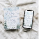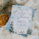 Winter Wonderland Baby shower invitation with blue snowflakes and pine trees, and boho design.