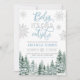 The invitation features snowflakes and evergreen pine trees with blue Christmas lights. This design is perfect for a winter baby shower for a boy.