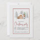 Winter bear and trees Happy holidays Christmas party Invitation that features a racoon in winter clothes, a house and snowfall.