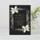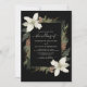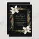 Winter pine cones and white flowers on a black with elegant script wedding invitation.