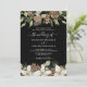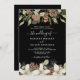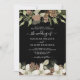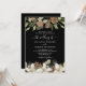 Winter pine cones and white flowers border the edges on a black with elegant script wedding invitation.