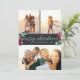 Our festive and elegant holiday card design is the perfect way to show off three of your favourite family photos. Design features "Merry Christmas" in modern white calligraphy script lettering on a charcoal background accented with green and red watercolor flowers. Personalise with your names and the year for a chic custom Christmas greeting, and add two portrait and one landscape photo using the template provided.