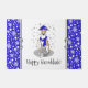 Winter Blue Whippet - Cute dog, out in the snow, wearing a blue scarf and knit cap or hat. He's sitting in front of a cup of steaming hot cocoa with marshmallows. Copyright © Angi Laframboise. Fun seasonal holiday dog breed cartoon gifts for dog lovers.
