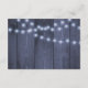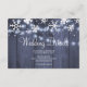 Rustic shimmering twinkle strings of hanging lights and white snowflakes wedding accommodation and directions details card on blue grey barn wood background. Ideal for your winter | elegant rustic chic | seasonal wonderland inspired weddings.