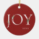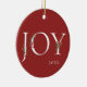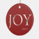 Winter botanical boughs, branches, and berries. Adorned "JOY", festive holiday red Christmas ornament.
