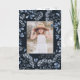 Elegant folded Hanukkah photo card features a favorite photo surrounded by a border of delicate blue botanical foliage and tiny watercolor flower blossoms on a rich navy background. Your custom holiday greeting and family name or names appear beneath your photo in chic white lettering. Add a custom pre-printed message to the inside.