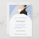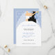 Winter Save the Date cards with a bride and groom on a snowflake background.