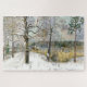 Artist by Zolotareva. watercolor on silk - manual drawing; the stone bridge through the river in the village.A view of a snow-covered bridge in the woods.There is snow, spectacular scenery.Stark white beauty of winter.