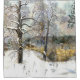 Artist by Zolotareva. watercolor on silk - manual drawing; the stone bridge through the river in the village.A view of a snow-covered bridge in the woods.