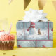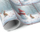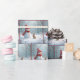 A snowman wearing a red hat and scarf stands cheerfully beside a small bunny, also dressed warmly, surrounded by a snowy landscape with gentle snowfall