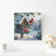 Bring the serene beauty of a winter wonderland to your home with this stunning AI-generated image. A vibrant red cardinal, a symbol of hope and joy, perches gracefully on a rustic, snow-covered birdhouse. The birdhouse is beautifully adorned with a festive Christmas wreath featuring bright red poinsettias, berries, and evergreen branches, all dusted with a fresh layer of glistening snow. The background reveals a peaceful, sunlit forest of snow-laden pine trees, creating a tranquil and magical scene.