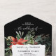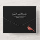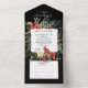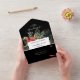 This Bright Black Botanical All in one Wedding invitations that include the wedding info and RSVP postcard that your guests tear off and and send. An inspiring combination of Christmas tree twigs and complemented by red and white rustic flowers with elegant red cardinal, forest twigs on elegant black background. This bright design will be a hit with all of your guests! Change the text and background colour by clicking on the "customise" button. Personalise the information by clicking the "details" button.