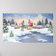 Winter Christmas landscape with snow-covered houses in a pine forest on the banks of a frozen river. Christmas holidays illustration.