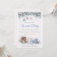 Winter gathering design featuring soft blue and ivory tones, pine garland with ornaments, and light snow texture. Detailed accents include lace-up boots, knit hat, and hot cocoa mug with candy canes. Script headline with clean layout suited for hosting a seasonal home party.