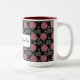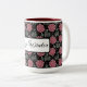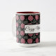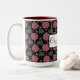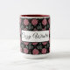 Seamless winter floral pattern featuring burgundy roses, pine leaves, red berries, and snowy dots on a black background for coffee mug