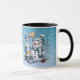Charming winter illustration with a smiling snowman, striped scarf, blue mug of cocoa, boots and pine accents. Soft blue palette, warm accents, and cozy season feel!