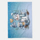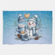 Charming winter illustration with a smiling snowman, striped scarf, blue mug of cocoa, boots and pine accents. Soft blue palette, warm accents, and cozy season feel!