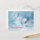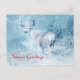 A seasons greetings postcard with a holiday message on the back. Designed with an image of a majestic deer in wintertime. An icy blue filtered background gives this photo a cold winter look with a magical feel. A noble deer stands on a hill with wintery pine trees in the background.