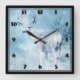 A clock with an image of a majestic deer in wintertime. An icy blue filtered background gives this photo a cold winter look with a magical feel. This proud, noble animal stands on a hill with wintery pine trees in the background.