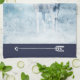 A kitchen towel with an image of a majestic deer in wintertime. An icy blue filtered background gives this photo a cold winter look with a magical feel. This proud, noble animal stands on a hill with wintery pine trees off in the distance. The top and bottom of this kitchen towel has a navy blue border with a white arrow illustration.