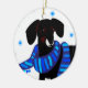 A black, brown and white Dachshund wrapped up warm in his blue scarf with snowflakes flurrying around. Close up image on one side and full body on the other side