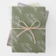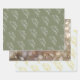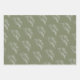 Set of three gift wrapping paper sheets featuring neutral green and sage colours with "Merry Christmas" in gold and silver script and festive stars and snowflakes. Measures 19" x 29" inches. Available in matte and semi-gloss finish.
