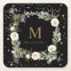 winter floral gold sparkle holiday monogram square square paper coaster
