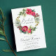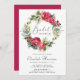 Elegant winter and Christmas holiday season bridal shower invitation featuring a watercolor wreath of pink and burgundy florals, pine, holly and other winter greenery and berries, a stylish script and modern typography.