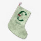 Pretty and festive holiday design features uppercase letter C with green shimmer fill and embellished with a winter flowers and foliage watercolor bouquet on muted distressed green harlequin pattern background. Personalise with name or other message