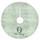 Pretty and festive holiday tree skirt features uppercase letter O  with green shimmer fill and embellished with a winter flowers and foliage watercolor bouquet on muted distressed green harlequin pattern background.  Personalise with name or other message