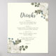 This winter floral on ivory wedding drinks menu sign is perfect for an elegant wedding. The simple design features white flowers with winter greenery and eucalyptus leaves, with a modern country feel.