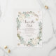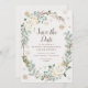 Save The Dates featuring winter floral, gold and silver snowflakes, and leaves.