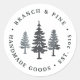 Rustic chic stickers for your outdoor, adventure, or nature-orientated business feature a trio of blue and grey pine trees with two custom text fields in a curved circular design.
