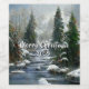 Beautiful Christmas wine label with a beautiful image of Winter day by the river. There are snow covered rocks, in a country, forest river. Tall pine trees stand on the bank of a flowing river.
