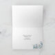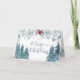 Personalised christmas card with elegant script typography. Watercolor design with pine trees, poinsettia and winter foliage in shades of blue grey and tidewater green.