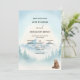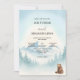 This winter wedding invitation showcases a peaceful watercolor mountain landscape with snow-capped peaks, misty pine trees, and a small brown bear adding a charming storybook feel. The soft blend of light blue, white, and muted grey tones creates an airy, romantic winter mood. The design includes editable text, making it easy to customise your names, date, and wedding details for a natural and elegant look.