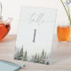 Guide your guests to their seats with ease and elegance using this winter forest table number sign from the Snow In Love collection. Designed with a serene watercolor landscape of snow-covered pine trees and soft mountain silhouettes, this table number card brings a peaceful, rustic charm to your winter wedding or event.
