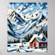 Am abstract pint of mountais with a cabin and smoke from its chimney under the snow