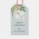 Festive Christmas gift tags feature a pastel sage green background with cascading white flowers, green leaves and botanical foliage. Personalise with your custom holiday greeting (shown with "Merry Christmas") and your names or family name. Blank on reverse side for hand-writing your gift recipient's name.
