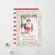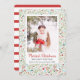 This beautiful card features a Christmas greenery floral pattern of light green, red, blue and grey. Script and classic typography are used with one large photo. The back of the card is a red and white stripe pattern.