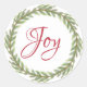 Elegant and modern festive envelope seal or gift sticker for Christmas with the text 'Joy' in red chic script calligraphy and a stylish winter greenery wreath on a white background. Exclusively designed for you by Happy Dolphin Studio. If you need any help or matching products please contact us through our store chat!