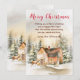 This beautiful and festive watercolor Christmas card can be personalised with your family name. It features a rustic winter cottage surrounded by snow and trees. There are adorable animals, such as a moose and a husky dog, and also foliage. The text combines handwritten script and sans serif fonts for a stylish and modern look.