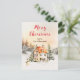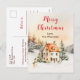 This beautiful and festive watercolor Christmas postcard can be personalised with your family name. It features a rustic winter cottage surrounded by snow and trees. There are adorable animals, such as a husky dog and a rabbit, and also a snowman and foliage. The text combines handwritten script and sans serif fonts for a stylish and modern look.