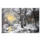 Snowy winter forest painting capturing a sunset moment with a water spring crossing the white ground, a house, and a deer hiding behind a tree.