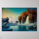 Oil landscape painting in the style of Roger Dean of an imaginary park in winter with overhanging cliffs and waterfalls.